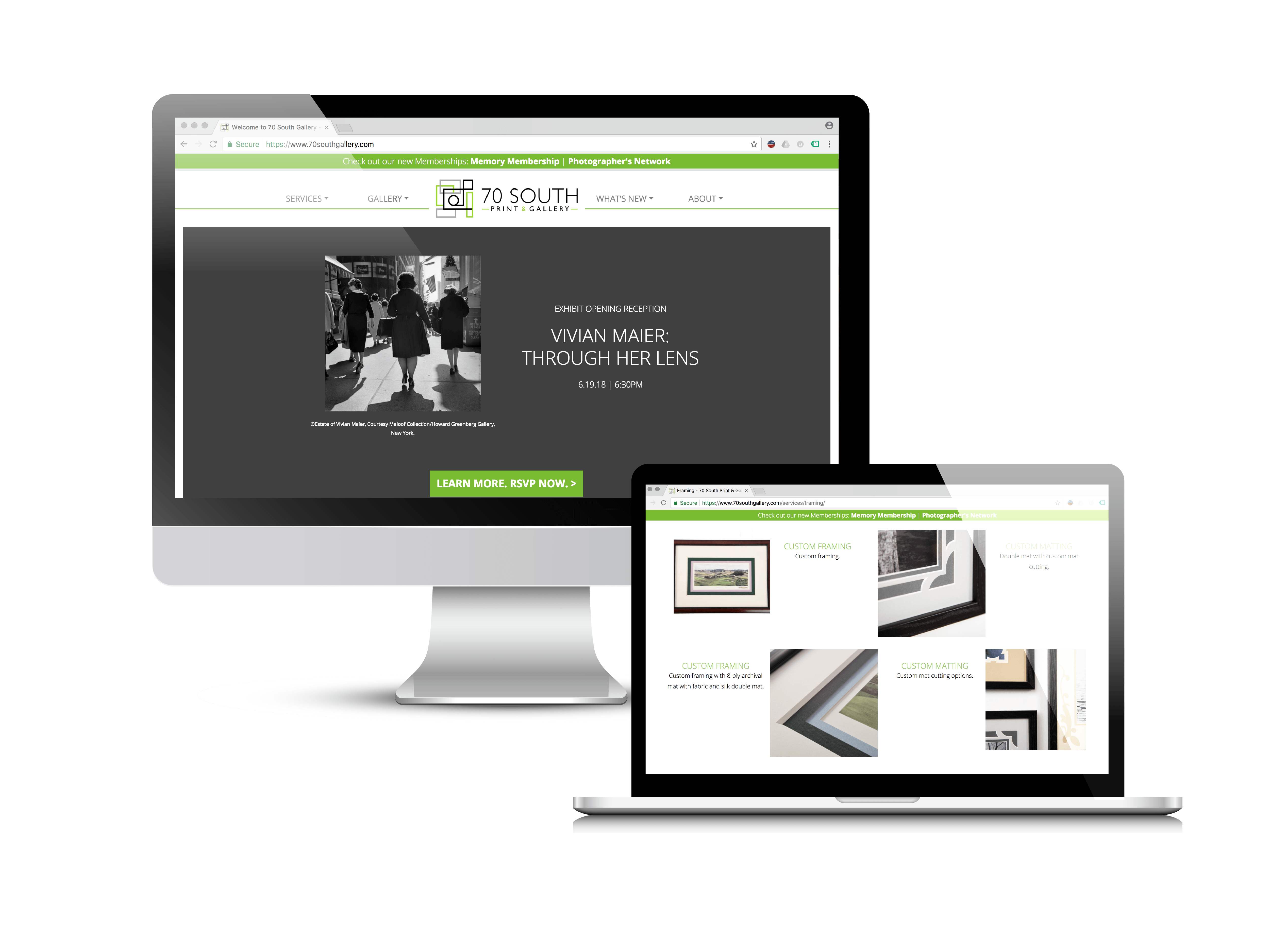 70 South Gallery is a photography gallery located in downtown Morristown, NJ that exhibits both professional and student artwork . It is also a place where users can bring digital files to be printed, create photo books, or get artwork framed, and they needed a website to explain that.